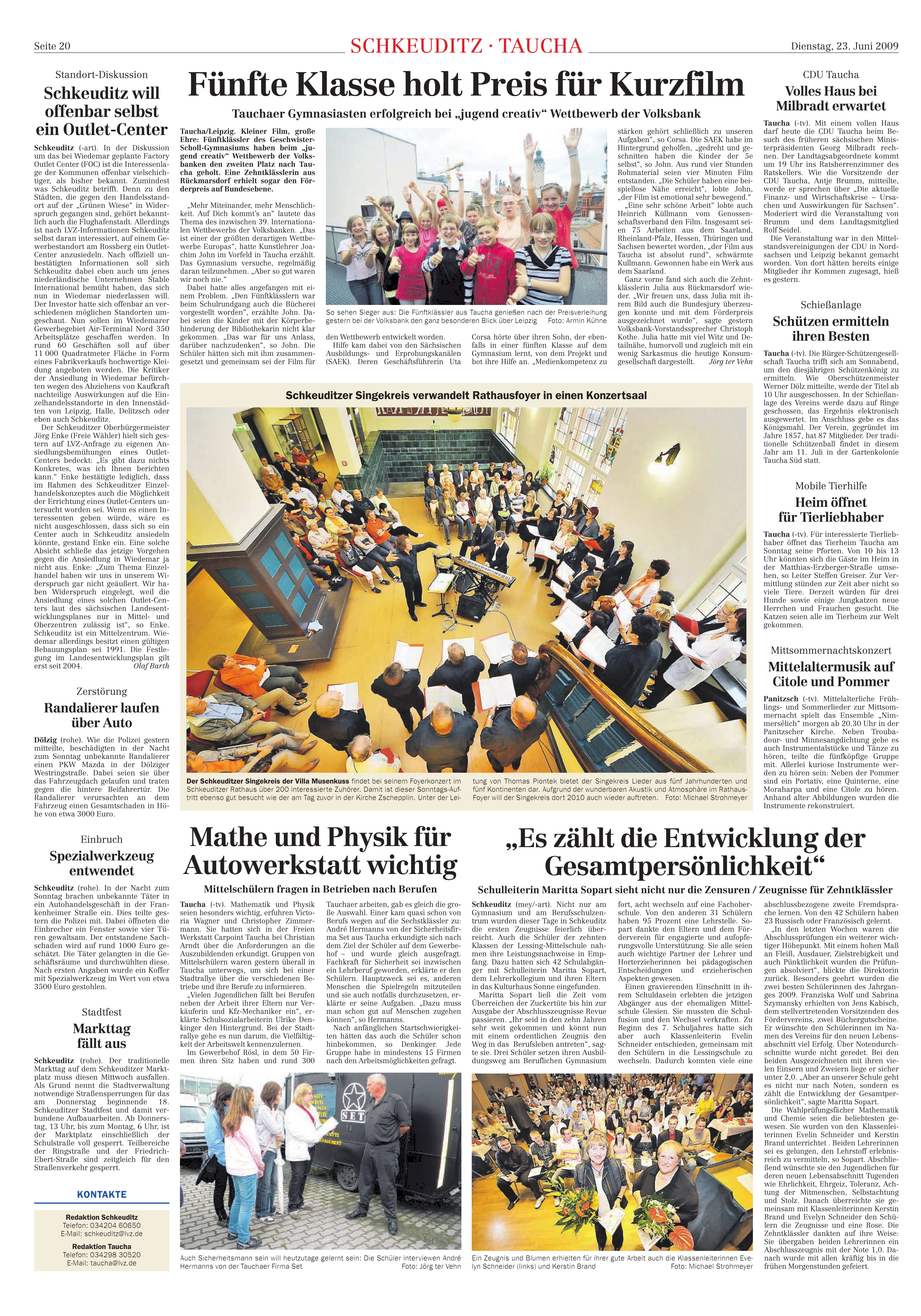 LVZ vom 23.06.2009 – Konzert des Schkeuditzer Singekreises im Foyer des Rathauses von Schkeuditz