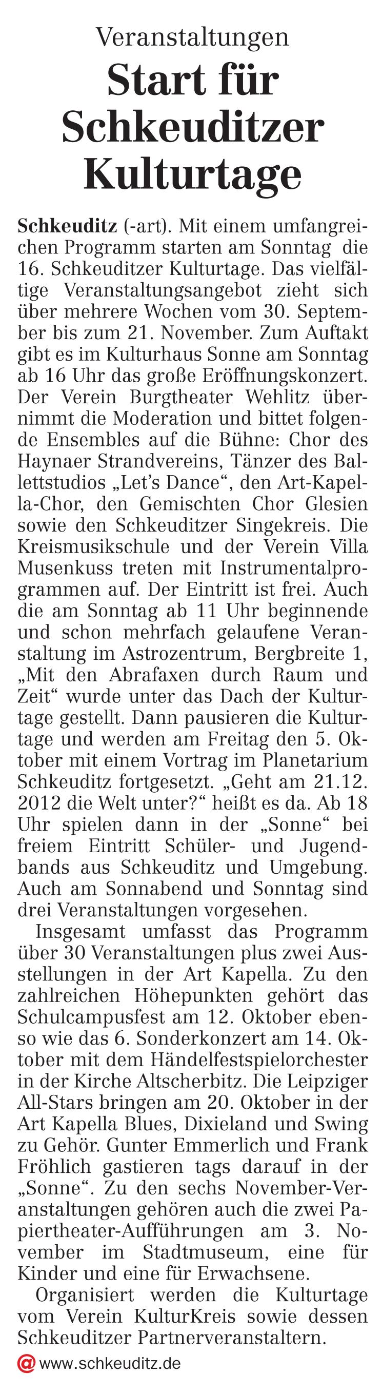 LVZ vom 27.09.2012 – Start für Schkeuditzer Kulturtage