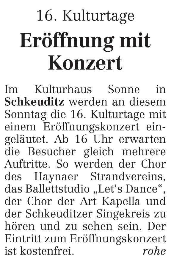LVZ vom 28.09.2012 Stadtleben Nord – Eröffnung der 16. Schkeuditzer Kulturtage mit einem Konzert im Kulturhaus „Sonne“
