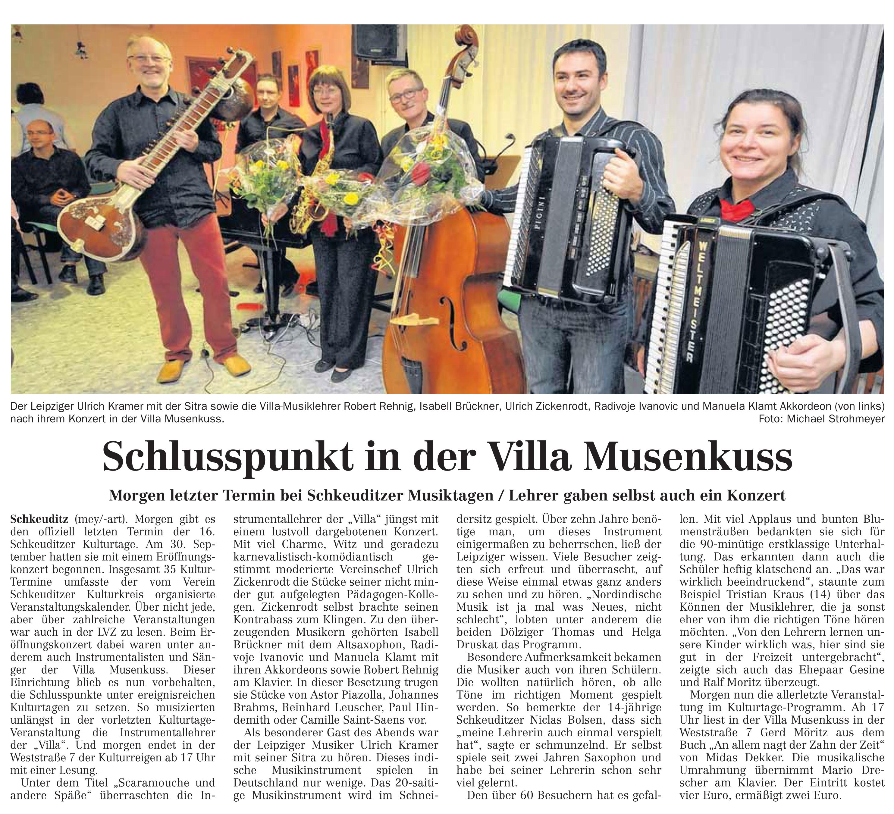 LVZ vom 20.11.2012 – Ende der 16. Schkeuditzer Kulturtage – Schlusspunkt in der Villa Musenkuss